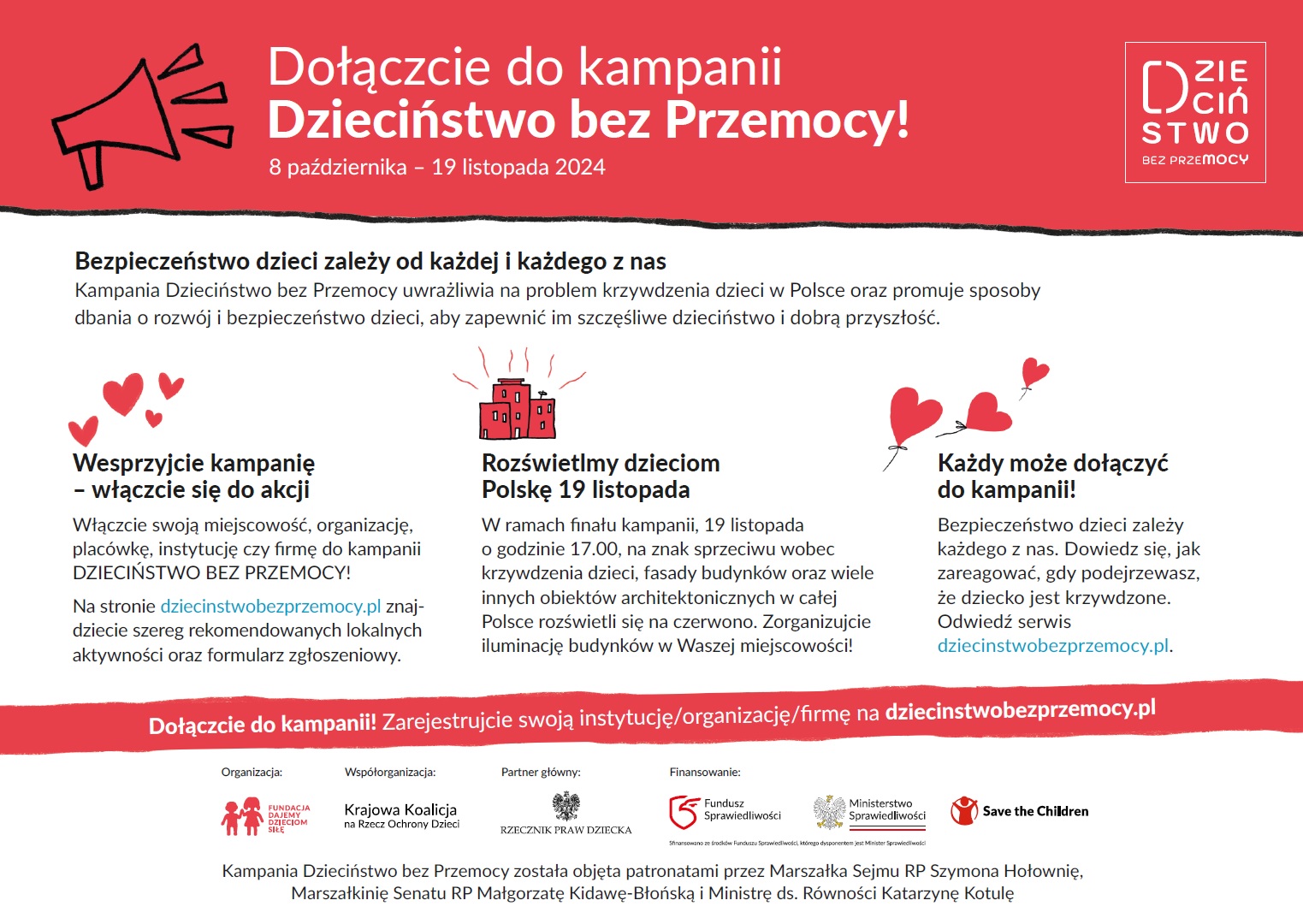 Do kampanii może przyłączyć się każdy, zarówno osoba fizyczna, jak i instytucja lub firma prywatna, szczegółowe informacje na stronie https://dziecinstwobezprzemocy.pl/