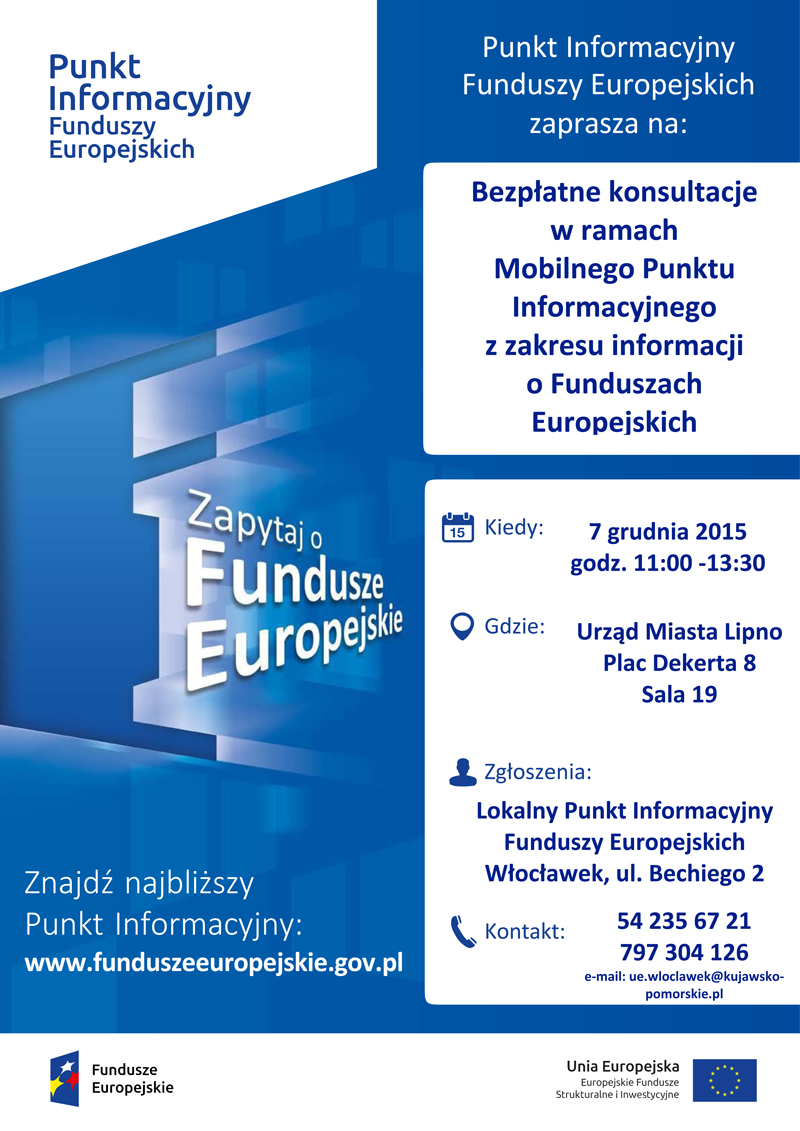 W ramach Mobilnego Punktu Informacyjnego Specjalistka Lokalnego Punktu Informacyjnego Funduszy Europejskich będzie udzielała bezpłatnie informacji w zakresie: