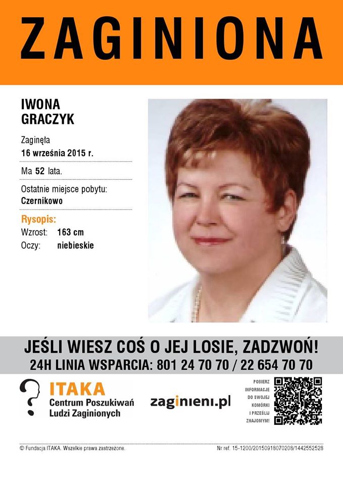 Niestety dotychczasowe poszukiwania Iwony Graczyk, także te powzięte przez wczorajszą grupę mieszkańców i strażaków, nie przyniosły rezultatu. Poniżej zamieszczamy plakat opracowany przez fundację ITAKA. Odpowiadając na wcześniejsze pytania - Iwona Graczyk w dniu zaginięcia ubrana była w czerwoną kurtkę i malinowe spodnie. Ostatnio widziana była na przystanku PKS w Czernikowie, gdy wsiadała do autobusu jadącego do Lipna. Na pewno dojechała do Steklina, jednak z autobusu tam nie wysiadła. Tu ślad się urywa.