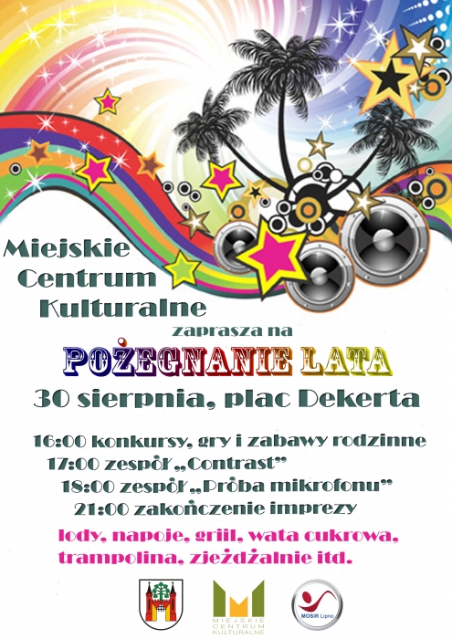 Miejskie Centrum Kulturalne serdecznie zaprasza wszystkich mieszkańców Lipna i okolic na letni festyn POŻEGNANIE LATA. Gry i zabawy rodzinne, występy zespołów "Contrast" i "Próba mikrofonu" to tylko niektóre z atrakcji czekających nas 30 sierpnia na Placu Dekerta w godzinach 16:00 - 21:00. Obecność obowiązkowa!