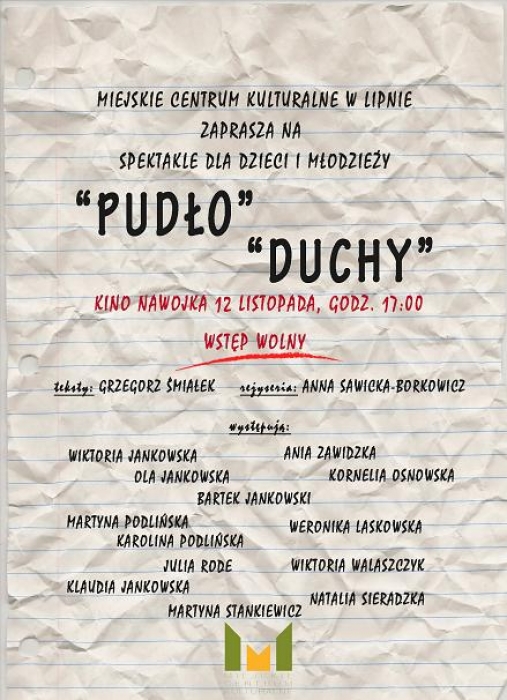 Miejskie Centrum Kulturalne zaprasza na dwa spektakle przeznaczone dla dzieci i młodzieży pt. "Pudło" i "Duchy". Autorem tekstów jest Grzegorz Śmiałek, reżyserem Anna Sawicka-Borkowicz. Obsadę stanowią dzieci i młodzież uczestnicząca w zajęciach teatralnych w naszym domu kultury.