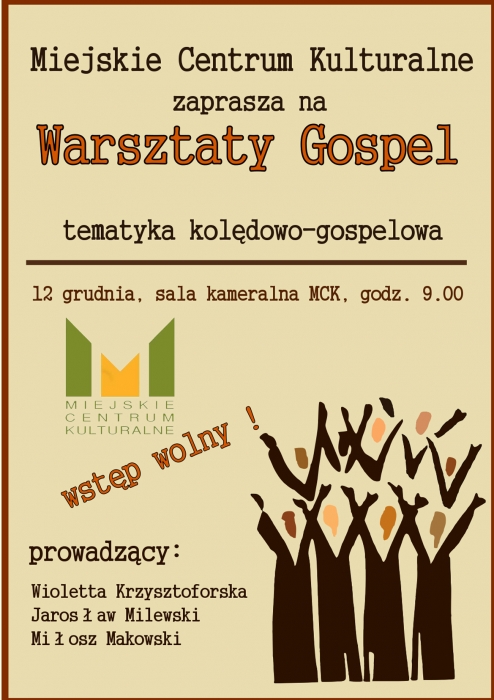 Zapraszamy wszystkich zainteresowanych rozwijaniem swoich zdolności wokalnych na warsztaty gospel, które odbędą się 12 grudnia o godzinie 9:00 w sali kameralnej Miejskiego Centrum Kulturalnego w Lipnie. Warsztaty poprowadzą: Wioletta Krzysztoforska, Jarosław Milewski oraz Miłosz Makowski. Gwarantujemy świetną zabawę przy wspólnym śpiewie!